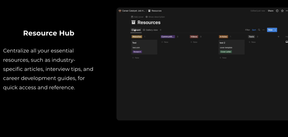 Centralize all your essential resources, such as industry-specific articles, interview tips, and career development guides, for quick access and reference.